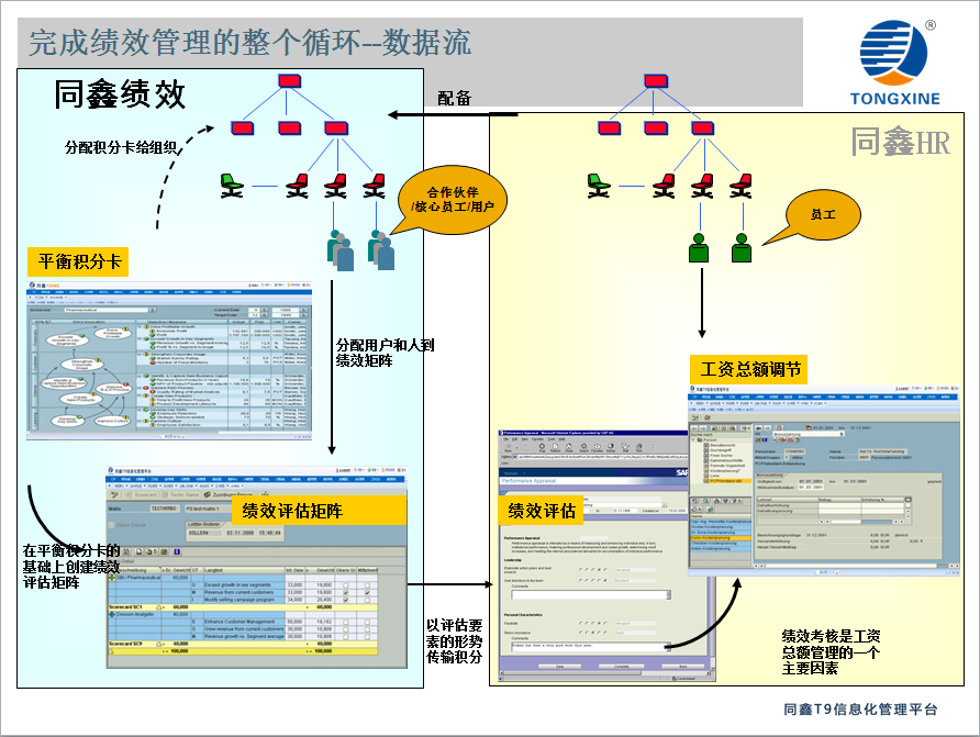 同鑫EHR系統引入了先進的績效考評技術,支持KPI,平衡計分法,360度等績效考評方法與各種指標體系。支持量化指標考核,也支持關鍵工作事項等不能量化的考核項目考核與跟蹤。