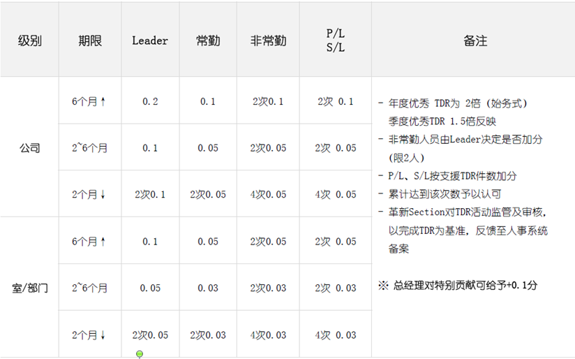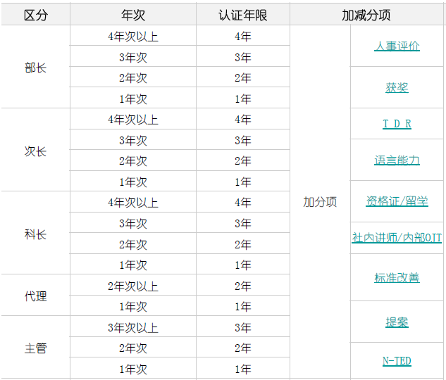 3.定義了七個(gè)職級(jí)的任職審核年限標(biāo)準(zhǔn),每個(gè)職級(jí)劃分為1年、2年、3年、4年及4年以上的認(rèn)證年限,并定義了每個(gè)職級(jí)的加減分項(xiàng):人事評(píng)價(jià)、獲獎(jiǎng)、TDR、語(yǔ)言能力、資格證/留學(xué)、社內(nèi)講師/內(nèi)部OJT、標(biāo)準(zhǔn)改善、提案、N-TED等方面的考核加減分項(xiàng);對(duì)必要資格定義如下:革新學(xué)校結(jié)業(yè)(在職期間需通過1次即可),且為學(xué)校結(jié)課時(shí)排名為參與人員的前10%,加分處理為第1名:0.1分;第2名:0.05分;而科長(zhǎng)升為次長(zhǎng):TOPIK需要2級(jí)以上;次長(zhǎng)升部長(zhǎng):TOPIK需3級(jí)以上;附圖為任證年限標(biāo)準(zhǔn):
