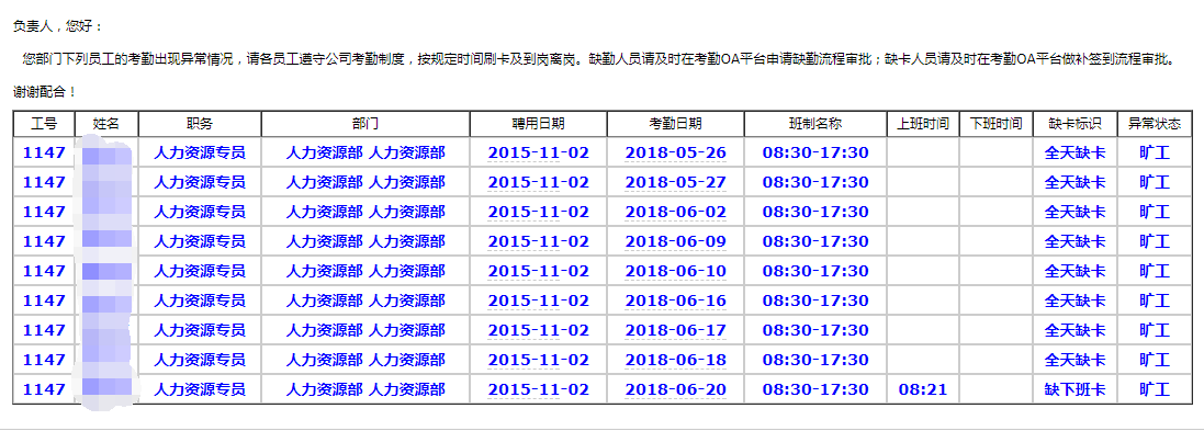 4、考勤異常下發(fā)通知、回饋不及時,溝通難度大。